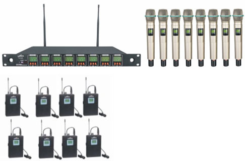 一拖八無(wú)線(xiàn)麥克風(fēng)可配手持麥、領(lǐng)夾腰包。
